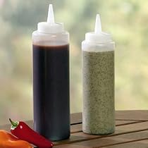 Kitchen Supply Company's 12–oz. clear bottles make food prep easy and fun. Tapered nozzle on bottle can be snipped to create thick or thin ribbons of sauce for decorating desserts frosting a cake or fast dispensing of salad dressing or condiments. Clear bottle shows level of contents. Top screws on firmly so it won't fly off no matter how hard you squeeze. Top–rack dishwasher safe.[]